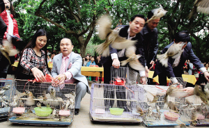 12月24日上午,在海口市人民公园,华侨陈沙立(左二)与海口市民一起,放生了1000余只鸟,其中不乏野生鸟类。