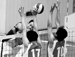 全国男排联赛 广东队胜四川队 12月25日,在中国排球联赛男子A组第三轮比赛中,广东队客场以3:2战胜四川队。图为广东队球员王兴龙(后)在比赛中扣球。 新华社发