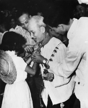 | 1960年3月,12岁的印尼归侨王廷群为到访的胡志明戴领巾。 |