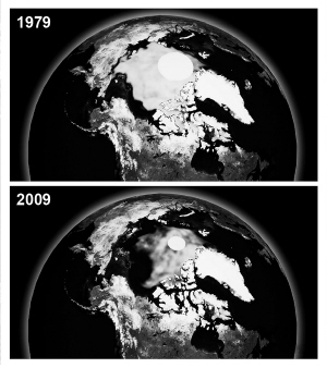 | 全球气候正在变暖。这是2010年7月28日,由美国国家海洋和大气局提供的展示北极冰盖1979年和2009年情况的卫星照片拼图。 新华社/路透 |