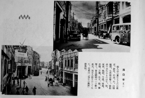 “输入物资主要有杂货、棉布、石油、米、白糖、面粉、化学制品等,输出物资有牛、猪、家禽、鸡蛋、牛皮、槟榔、红糖、芝麻、瓜子、籐、盐等,年贸易额达一千数百万元,每年是入超的情况。照片所示是“海口的银座”新兴街。”(《海口市》)
