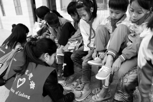 | 志愿者为孩子们试穿新鞋。 |