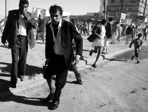 | ←12月24日,也门首都萨那,一名抗议示威者在冲突中受伤。