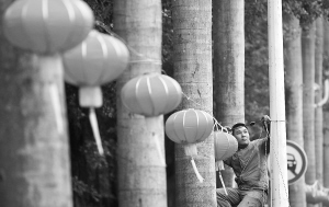 12月26日,海口市海府路,施工人员在行道树上挂满了红灯笼,为即将迎来新年的椰城增添了一抹喜庆色彩。 本报记者 李英挺 摄
