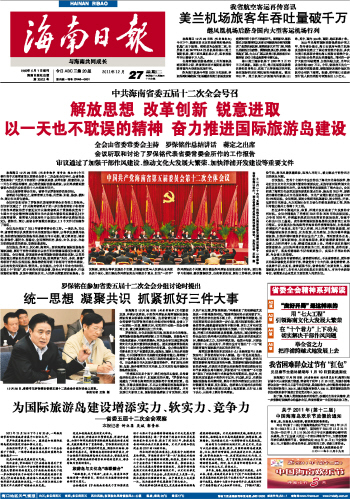海南日报 首版 001 2011-12-271 2011年12月27日 星期二