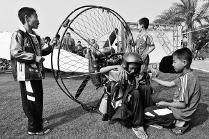 | 几位小朋友被动力滑翔伞所吸引。