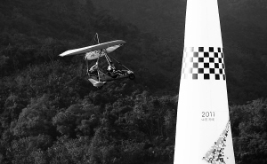 如果把20米高的充气标柱看成一枚枚巨大的花蕊,五颜六色的动力悬挂飞行器恰似一只美丽的彩蝶,轻巧的绕着“花蕊”飞行。今天下午,在万宁日月湾的海边洼地,参加2011环海南岛飞行拉力赛的中国航协动力悬挂飞行队,化身彩蝶,在蓝天下进行了精彩的绕标表演。