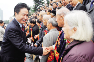 | 12月28日,海南农垦创建60周年纪念大会在省人大会堂举行。图为省委书记罗保铭与“海南农垦创建60年60名杰出人物”代表亲切握手。 本报记者 王凯 摄 |