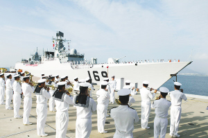 完成亚丁湾第九批护航任务,12月27日上午,海军“武汉”号驱逐舰凯旋,回到母港———三亚某军港。图为亚龙湾基地军乐队在迎接。 通讯员 肖迎辉 本报记者 苏建强 摄