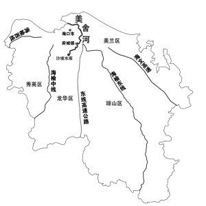 美舍河发源于海口市南部羊山地区,全长23.86公里,从上游的沙坡水库一路向北汇入海甸溪,最终归入琼州海峡。