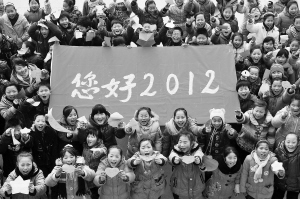 2011年12月31日,河南省温县南张羌镇南张羌村小学的学生举起“您好2012”字样的横幅和他们亲手制作的心愿卡,迎接2012年的到来。 新华社发