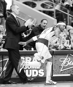 3日,在NBA常规赛中,小牛队主场以100:87胜雷鸣队。图为小牛队杰森·特里(右)在比赛中庆祝得分。 新华社发