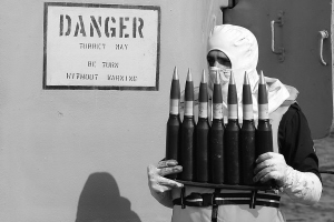 | 近日,在霍尔木兹海峡附近海域,一名伊朗军方人员在一艘海军舰船上运送弹药。 新华社/路透 |