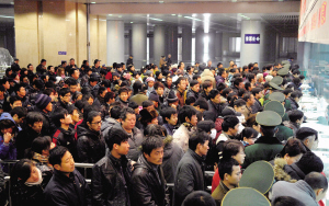 | ↑天津站临时售票处排起了长队。 新华社发 |