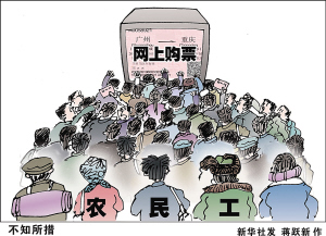 不满的声音里,有网上购票遇阻的网民,还有压根儿与网无缘的农民工。日前,一名在温州打工的重庆籍农民工在写给铁道部的信中,用质朴而激烈的言辞表达不满,指责网络购票挤占甚至剥夺了没条件、无能力使用网络者的购票机会,让本已弱势的群体雪上加霜。