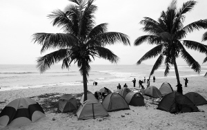 | 国内冲浪爱好者在海边扎帐篷观战。