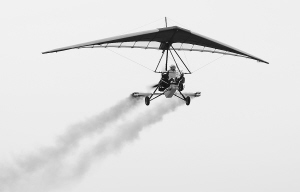 | 去年底首届环海南飞行拉力赛上,一架动力悬挂滑翔机在海口湾上空进行飞行表演。 |