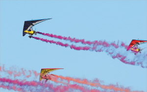 | ↑2011年在山东莱芜举办的中国国际航空体育节上,动力三角翼飞行器编队拉烟飞行表演。 |