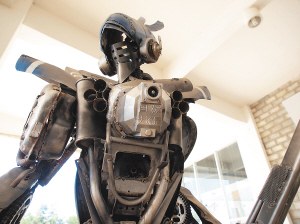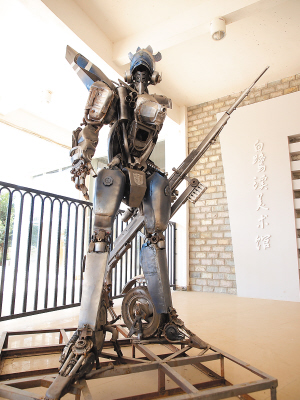 这是一个废旧摩托车零件的重新组合体———两个车轮是战士的两只“后脚跟”,两个油箱化作战士“遒劲有力的大腿”,一部已经废弃的发动机则是战士“强大的心脏”……