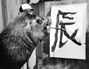 在日本横滨的一家海洋馆内,一只海狮叼着毛笔写字。 这家海洋馆在今年的新年假期推出一系列活动吸引游人。 新华社/法新