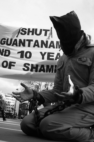 1月7日,在英国首都伦敦,打扮成关塔那摩监狱囚犯的抗议者展示镣铐。 2002年1月,美军在位于古巴的关塔那摩军事基地内建立了一所监狱,将抓获的大批“基地”组织和塔利班成员关押于此。随着美军一系列虐囚事件曝光,关塔那摩监狱的恶劣状况受到国际社会的广泛关注。 新华社发