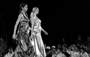 1月10日,2012年万宁日月湾国际冲浪节举行“踏浪”时尚沙滩秀。海南“第一美差”全球五强选手与外籍模特演绎绚丽时装秀。 → 模特在展示泳装。 ↓ 模特在展示晚装。