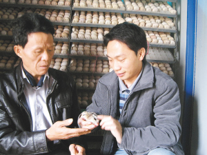 | 张先敏(右)和王绥兴一起在农户家察看山鸡孵化情况。 范南虹 摄 |