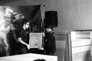 | 10日,台北故宫工作人员将壁画《史诗缪斯·卡莉欧普》从木箱内取出。 新华社发 |