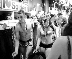 1月11日,仅着内衣的顾客在法国里昂的Desigual专卖店里抢购货品。 当天,西班牙时装品牌Desigual在其位于法国里昂的专卖店展开“特卖”活动。在促销活动开始后,前100名仅着内衣到店购物的顾客即可免费获赠2件服装。新华社/路透