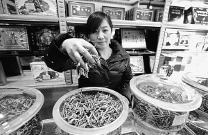 | 拉萨市宇拓路一家虫草店铺的售货员在展示冬虫夏草。 新华社发