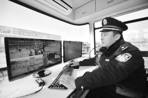 1月11日,宁夏银川公安局中山南街派出所民警在流动警务车上监控区域治安情况。为了增强治安防控能力和便民服务,4辆“全副武装”的流动警务车日前亮相银川街头。该车车顶配有4个能360度旋转的摄像头,车头上方装有LED宣传屏幕。车内配有视频监控系统、电脑、打印机、办公桌等设备,还配备了空调、微波炉、微型冰箱、饮水机、医药箱等便民设备,其功能不亚于一个派出所。 新华社发