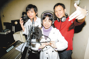 | 《定安娘子》的作者金安仔(左)、流星阿文(右)和演唱者含月(中)。