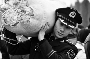 ↑为保证2012年春运期间农民工包车安全返乡,山东乳山市乳山口镇边防派出所6名边防民警义务当起农民工返乡包车的“随车警”,随农民工一起乘车。图为“随车警”帮助农民工搬运行李。