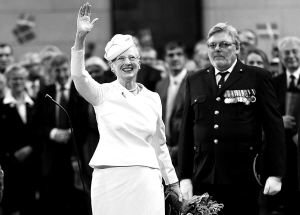 1月14日,丹麦女王玛格丽特二世在哥本哈根市政厅向来宾招手致意。 丹麦首都哥本哈根14日举行盛大游行活动,庆祝女王玛格丽特二世登基40周年。 新华社/法新