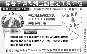 标普在公司网站上发布的公告说,由于欧洲金融稳定工具的两个主要保证人法国与奥地利的评级由AAA级下调至AA+级,且这两个国家的长期展望为负面,这意味着这两个国家信用评级在2012年或2013年内至少有三分之一的可能性再次遭到下调。这意味着欧洲金融稳定工具不能完全得到AAA评级的担保人或相同评级的流动性证券的担保。