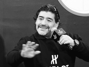 1月17日,马拉多纳抵达上海出席一个儿童慈善事业的活动,并现场为小球员传授球技。图为“球王”马拉多纳在慈善活动上问候球迷。 新华社发