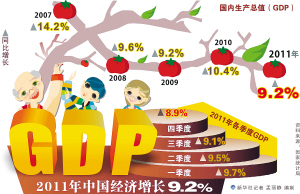国家统计局初步测算显示,2011年中国经济比上年增长了9.2%。其中一季度增速为9.7%,二季度9.5%,三季度9.1%、四季度8.9%。