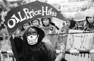 | 一名菲律宾抗议者打扮成死神的模样手持写有“油价高涨”字样的镰刀形标语抗议油价过高。