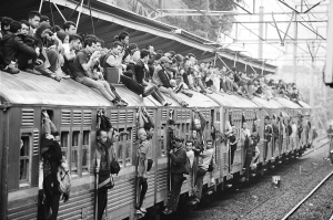 1月18日,一辆在高峰时段“挂”满乘客的火车抵达印尼首都雅加达的火车站。 为阻止乘客攀爬上车顶搭乘火车,印尼政府最近出台奇招,计划将一些水泥球悬挂在火车经过线路的上空,当火车经过水泥球下方时,水泥球就会击中车顶上的人。 新华社/法新