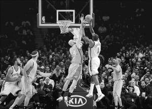 19日,在NBA常规赛中,纽约尼克斯队主场以88比91不敌菲尼克斯太阳队。图为太阳队球员马尔钦·戈塔特(上左)在比赛中防守尼克斯队球员斯塔德迈尔的上篮。 新华社发