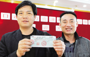 | 1月18日下午,邹光泽、陈伯桃代表40名农民工,在海口市劳动保障监察支队领到海南省第一建筑公司清还的30万元工资。 本报记者 苏晓杰 摄 |