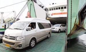 ↑ 春节将至,海口港码头,自驾来海南的外地车络绎不绝。 本报记者 李英挺 摄