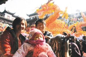 | 1月25日,一家游客在上海城隍庙拍照留影。 新华社发(黎自立 摄) |