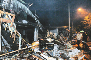 1月24日,在泰国中部素攀武里府,两名男子走过在火灾中损毁的房屋。 泰国中部素攀武里府24日晚举行的“欢乐春节”活动,由于燃放烟花不当引发火灾,目前已造成4人死亡、数十人受伤。 新华社发(拉亨摄)