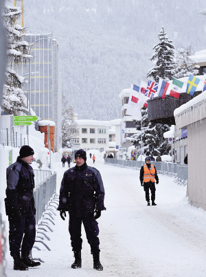 | 第41届世界经济论坛年会举办地瑞士滑雪胜地达沃斯。图为安保人员在会场入口站岗。新华社发 |