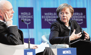 | 1月25日,在瑞士滑雪胜地达沃斯,世界经济论坛主席施瓦布(左)与德国总理默克尔出席2012达沃斯年会开幕式。 新华社/世界经济论坛 |