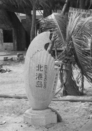 从铺前港乘渡船到北港岛仅几分钟时间,还来不及细看海上风光,转眼就到北港岛码头了。在北港岛入口处,有一海螺型的石碑上书“北港岛”,沿海岸是一片椰林和吊床,一些老人和孩子在悠闲地午休,看上去是那么宁静祥和。至今,北港岛依然保持原状。没有繁华都市的喧嚣和吵杂,漫步于椰林村道上,流连于海边红树林,能看见海上渔排及海岛人家特有的生活场景,能默默地感受着他们闲适而淡定的生活。在海水退潮时,还能看到古耕地阡陌纵横,古村庄的废墟隐约可见。因此,一拨一拨人来到北港岛,寻找幸存的村庄遗址,在海边徜徉,凭吊沉沦于海底的古人,就像寻找久违的故人。