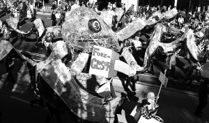 | 近日,美国加州帕萨迪纳举办新年玫瑰花车巡游时出现大批“占领”运动示威者,他们手举寓意金融机构和富人搜刮财富的八爪鱼“花车”和标语牌。 新华社/法新 |