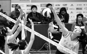 女排联赛胜浙江 天津队进四强 1月31日,在中国女子排球联赛第13轮比赛中,天津队在主场以3:2战胜浙江队,进入4强。 图为浙江队球员罗瑜(右)在比赛中扣球。 新华社发