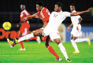 非洲杯足球赛 苏丹胜布基纳法索 1月31日,在2012年非洲杯足球赛B组小组赛中,苏丹队以2:0战胜布基纳法索队。图为苏丹队球员艾哈迈德(前左)与布基纳法索队球员纳库拉马拼抢。 新华社发